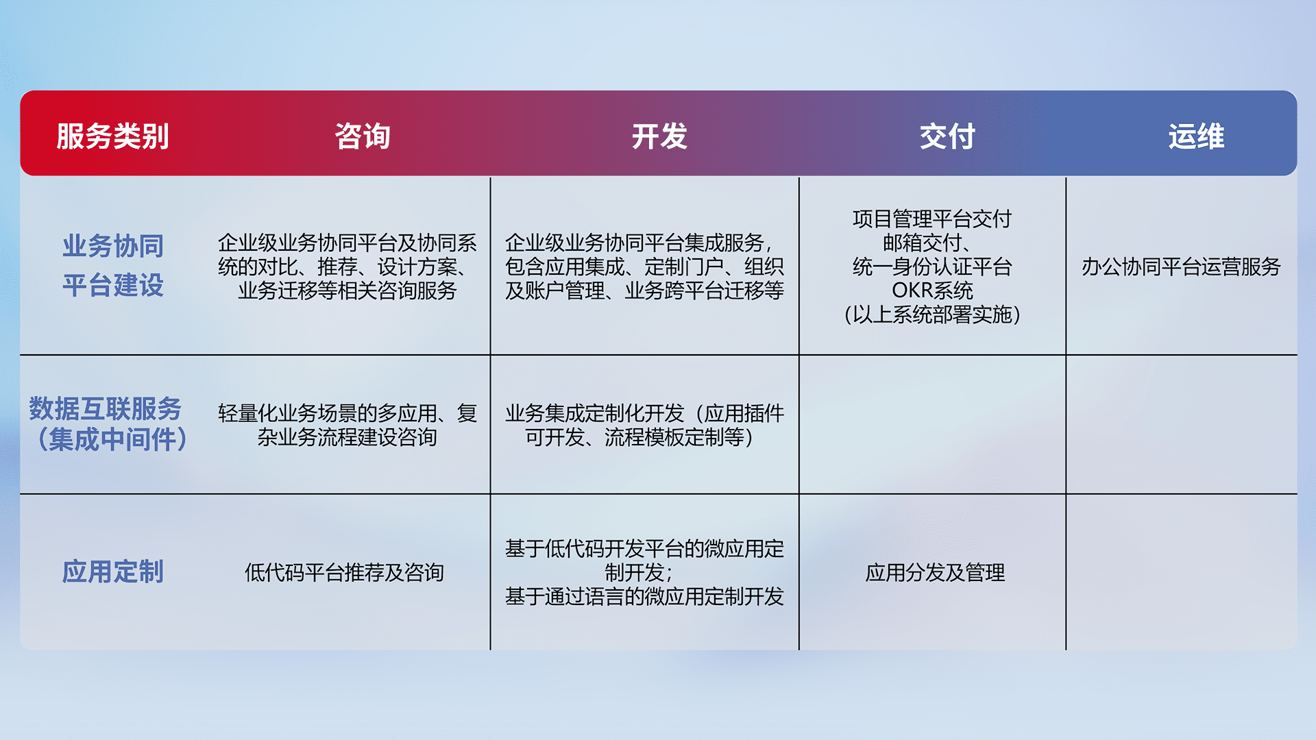 针对钉钉、、企微、、IDaas等平台级产品提供产品的规划、、、、方案、、、、交付、、、、定制化开发等服务,,,实现如统一协同办公、、、智能客户服务、、混合会议管理、、、、智能数据查询、、等业务场景,,,,实现数字化转型。。