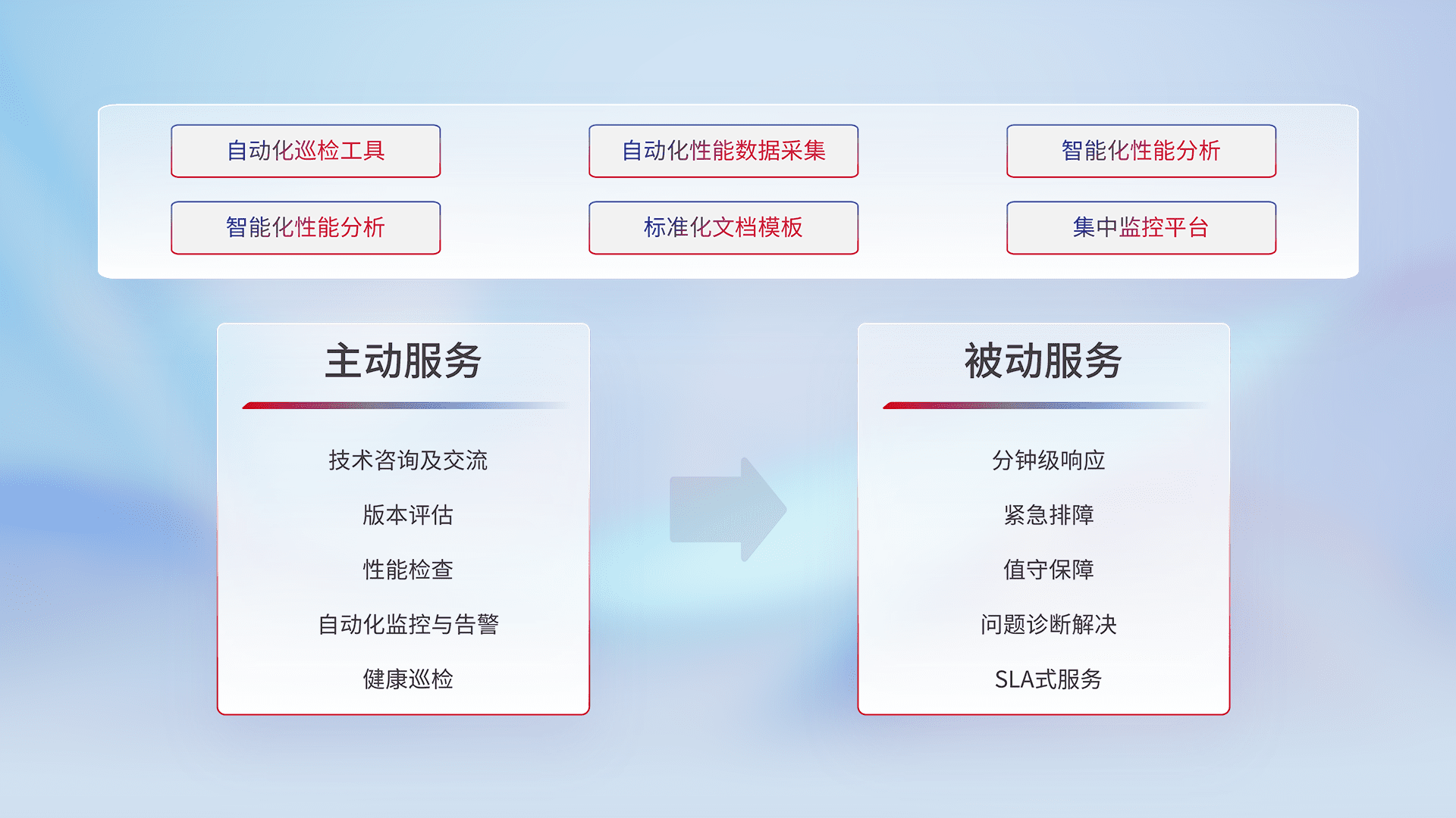 智能化工具和标准化文档,,保障服务质量,,提供主动服务(包含技术咨询、、、版本评估、、、性能检查、、、、自动化监控与告警、、健康巡检)和被动服务包含(分钟级响应、、、、紧急排障、、、值守保障、、、问题诊断解决、、、、SLA服务)。。